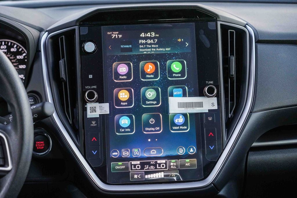 - Radio: Subaru 11.6" Multimedia Plus System -inc: valet mode, AM/FM stereo, HD Radio, multi-touch gesture high resolution display screen, voice activated controls, Bluetooth® audio streaming and hands-free phone connectivity, Bluetooth® hands-free SMS text messaging connectivity, iPod control capability, smartphone integration: wired and wireless Android Auto w/full screen view, wireless Apple CarPlay w/full screen view and wireless connection, USB and Over The Air (OTA) audio system update, audio system and Bluetooth® steering wheel control switches, 6 speakers (2 dash panel tweeter, 2 front door, 2 rear door), illuminated 3.5mm auxiliary input jack, illuminated USB A and C input charge ports, roof mounted satellite and connected services, roof mounted black antenna, connected services operation indicator, SOS emergency assistance (red button) and ehanced roadside assistance (blue i-button)